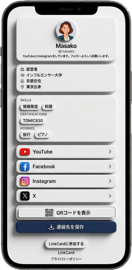 LinkCard は、SNS・経歴・スキルをスマートなプロフィールページにまとめるデジタル名刺。 QRコードやNFCでシェアして、あなたのブランドを伝えましょう。